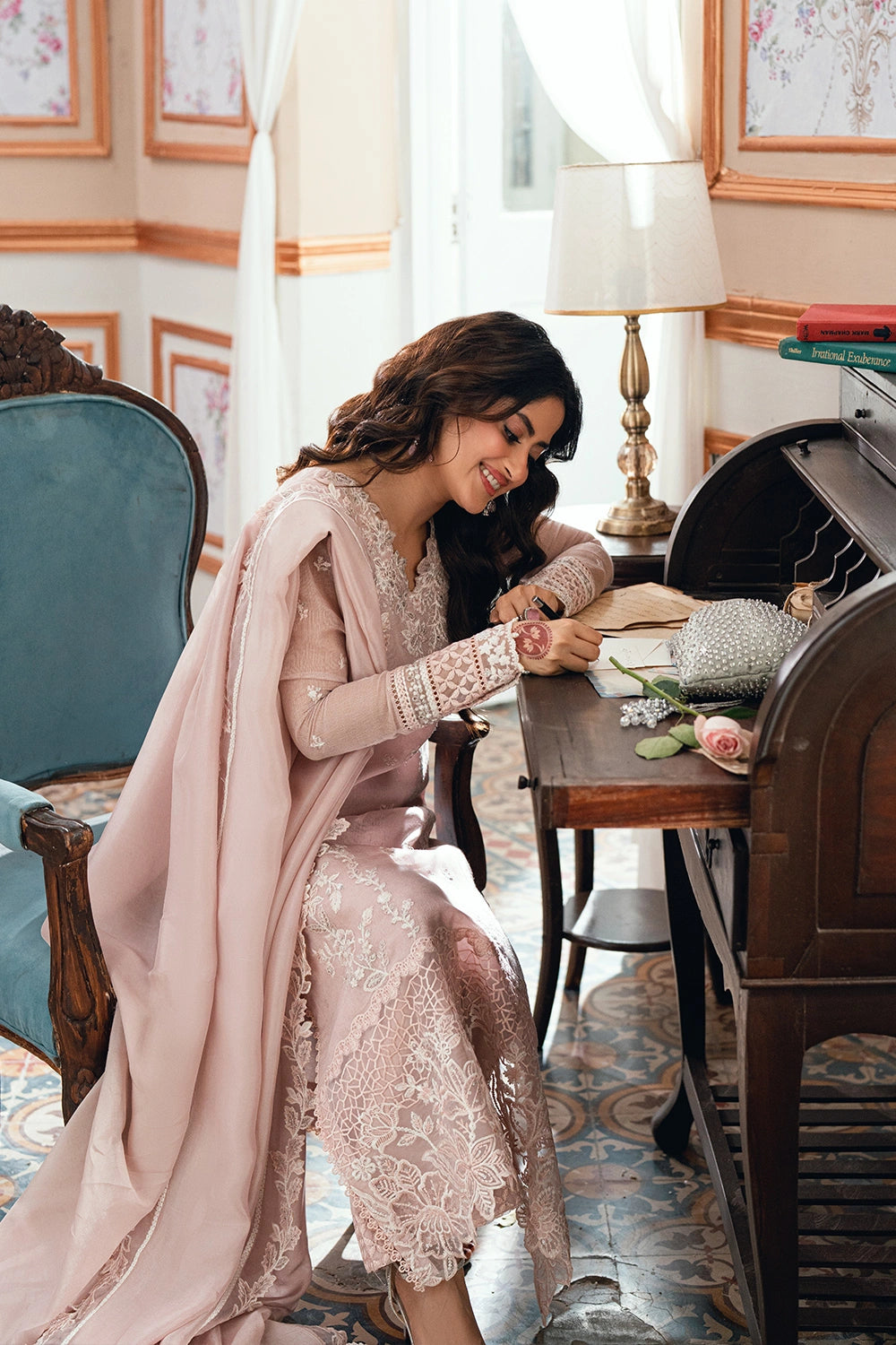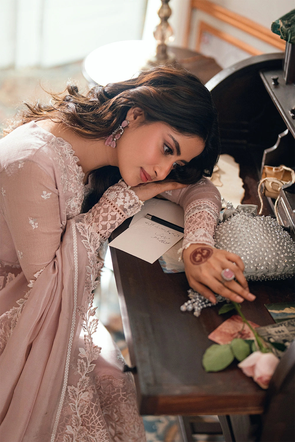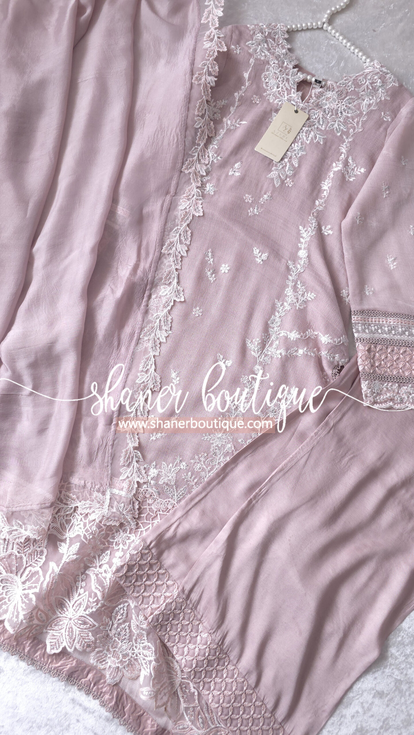DESCRIPTION: Rosebud is a soft onion-pink khaddi net, with cotton silk trouser & viscose silk dupatta, radiating delicate femininity.