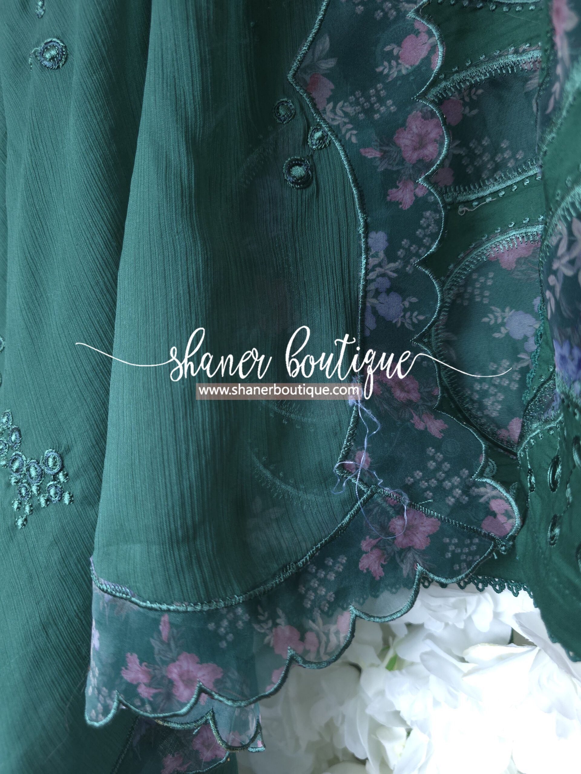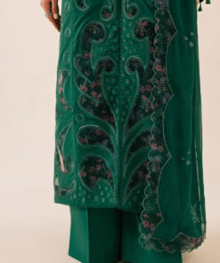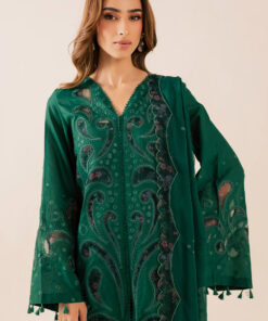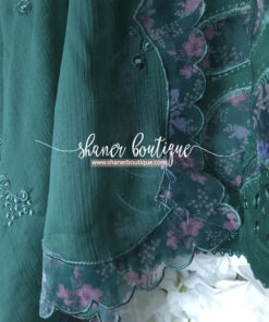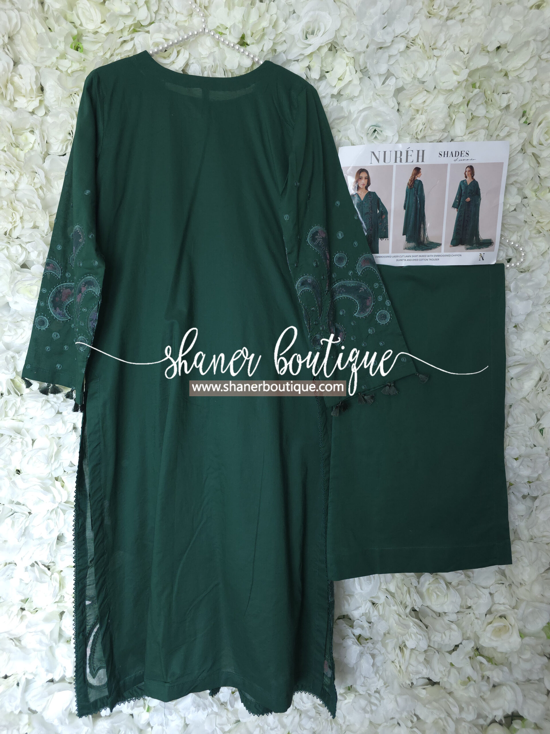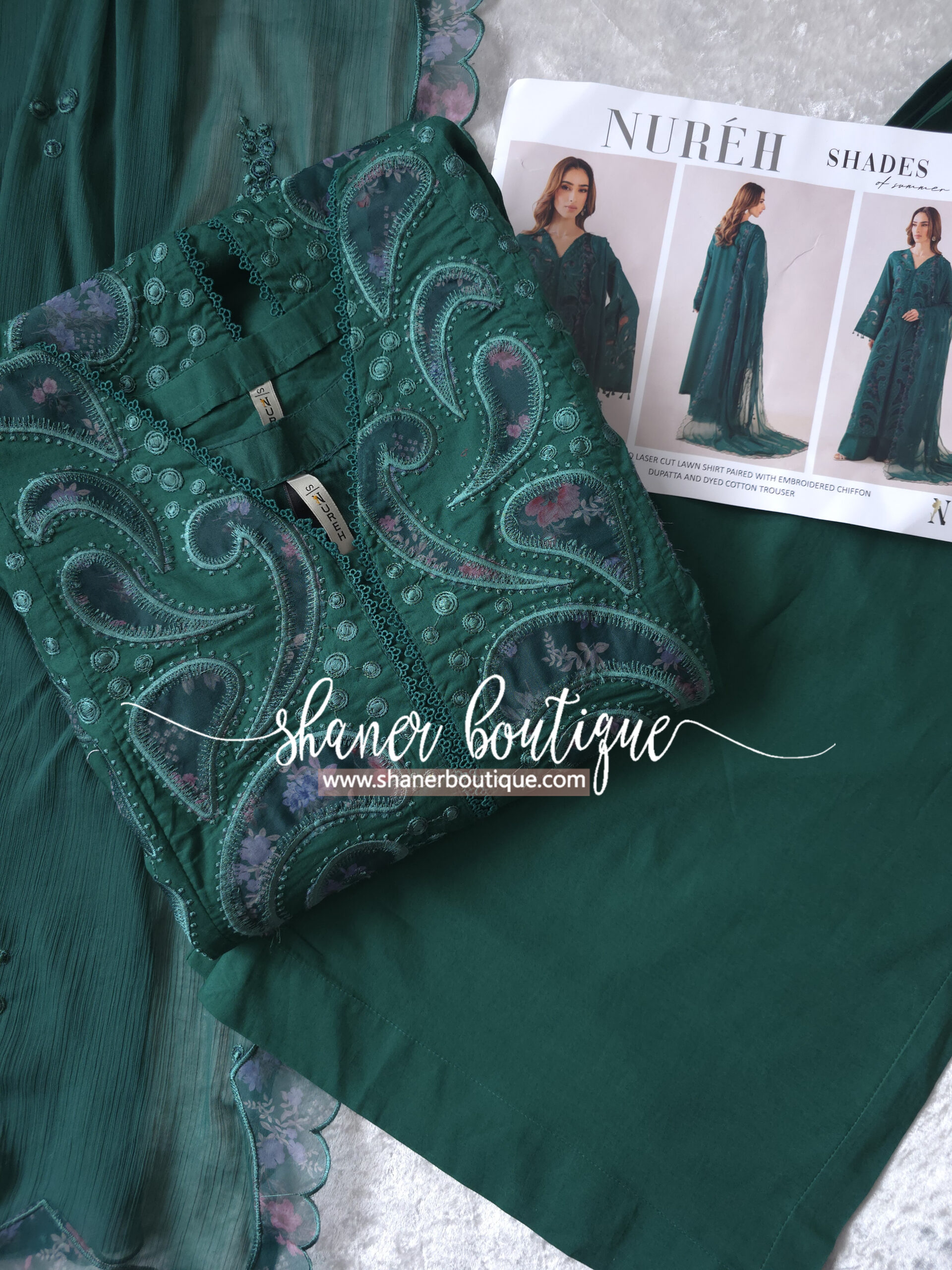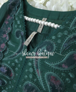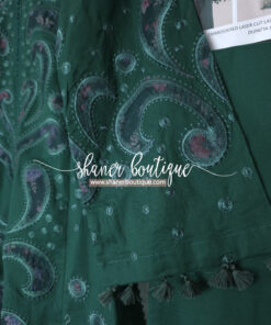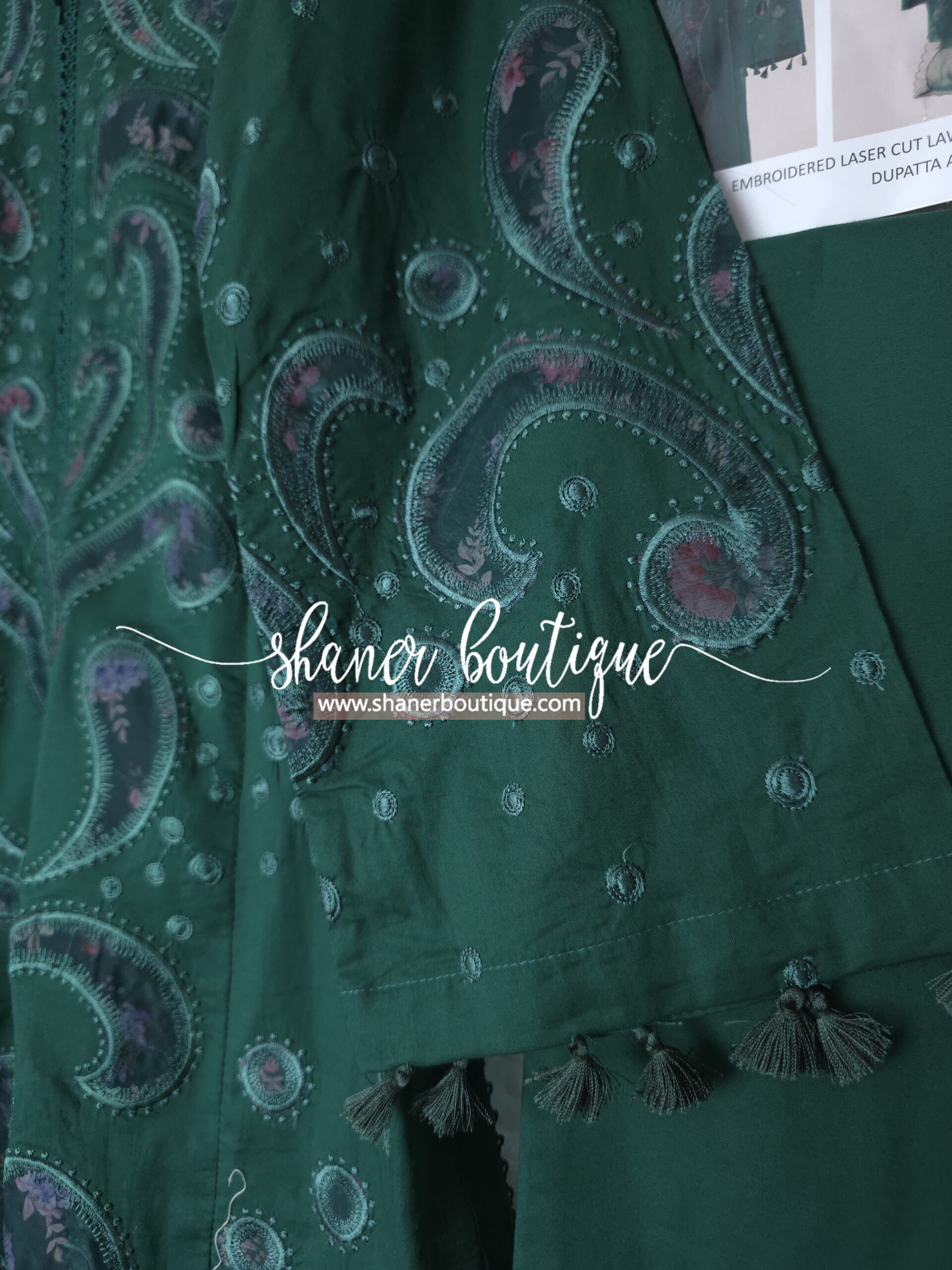 Color and Fabric: The outfit is a rich emerald green. The shirt fabric is described as lawn, the trousers are cotton, and the dupatta is chiffon.