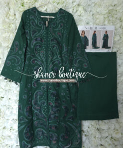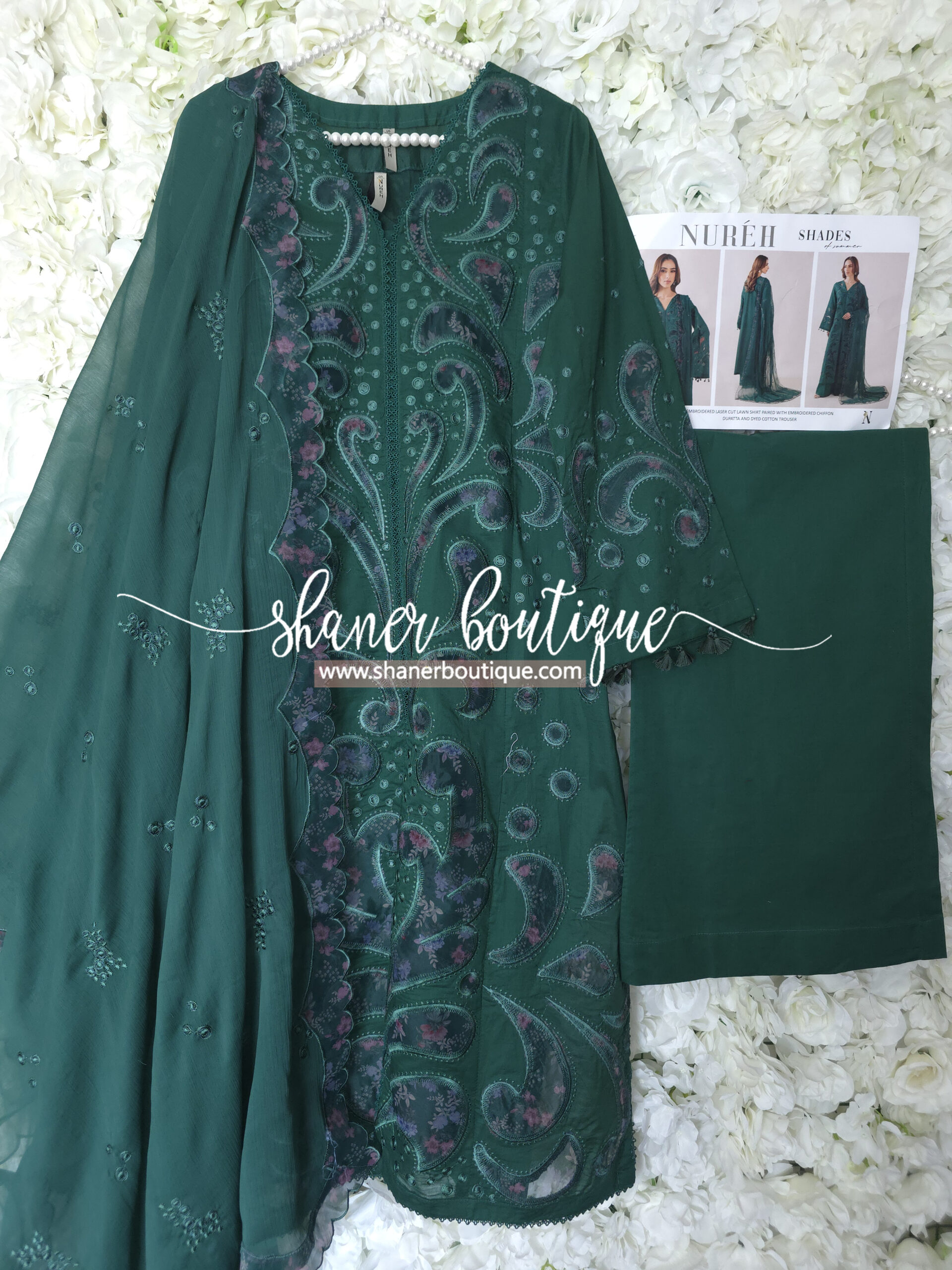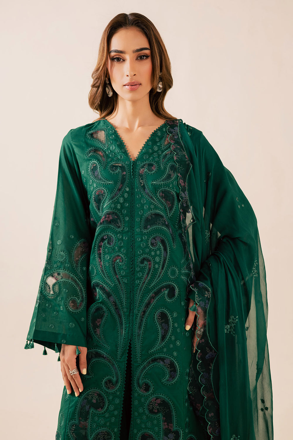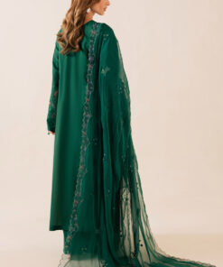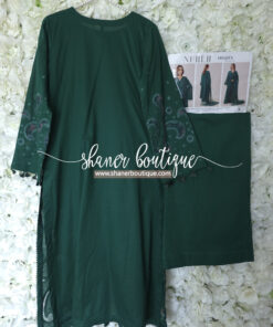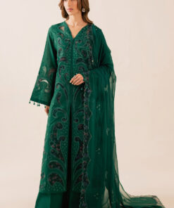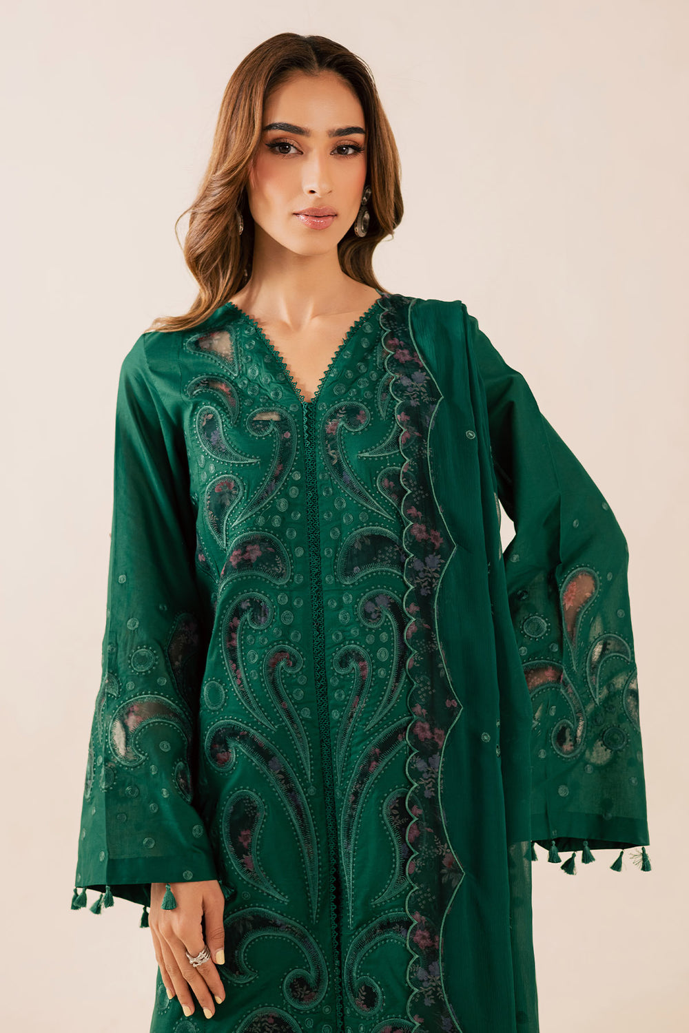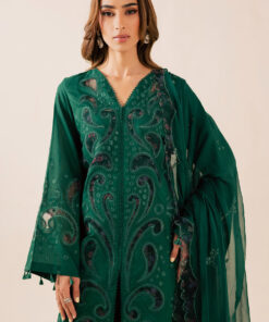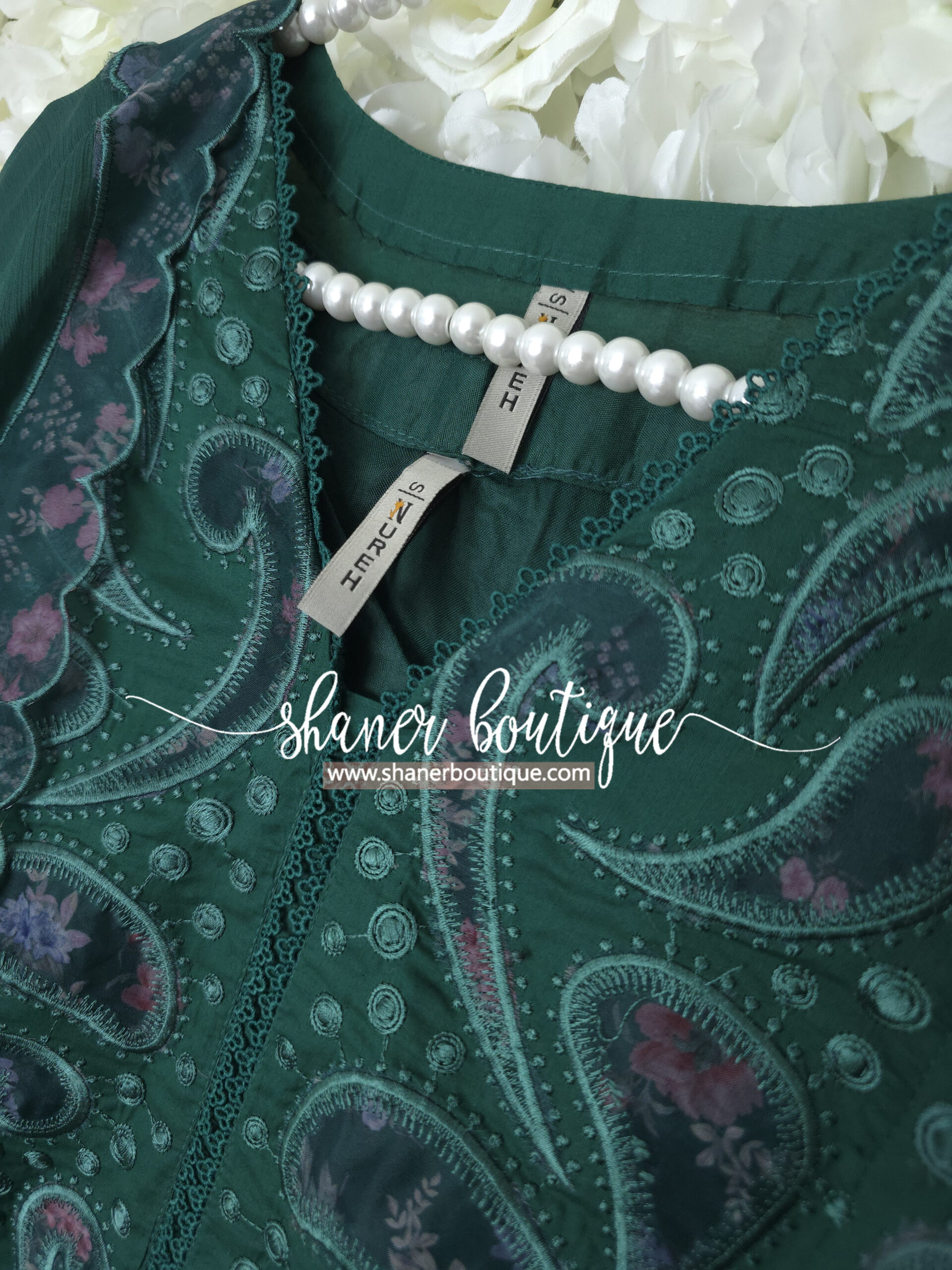 Color and Fabric: The outfit is a rich emerald green. The shirt fabric is described as lawn, the trousers are cotton, and the dupatta is chiffon.