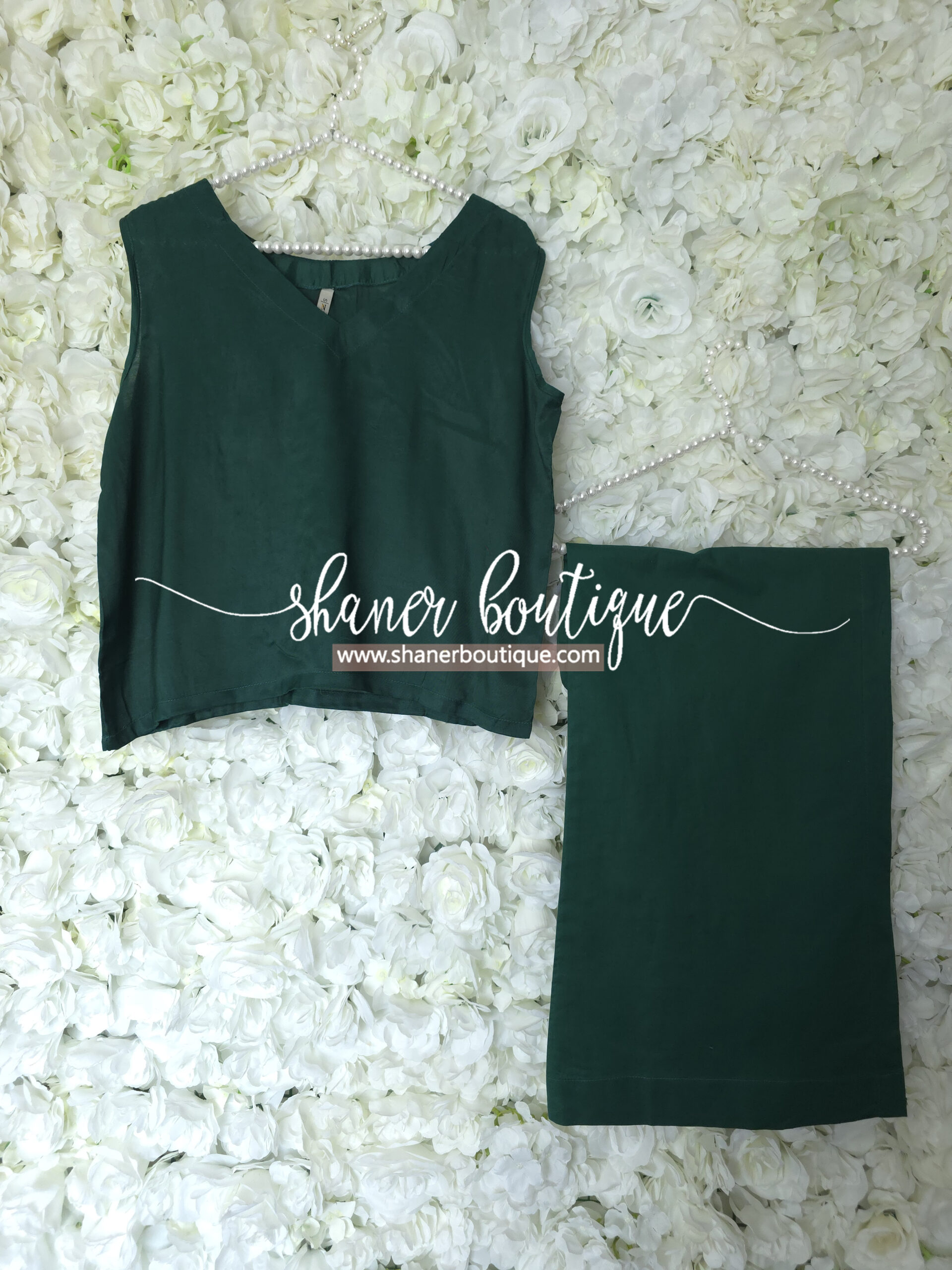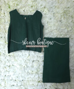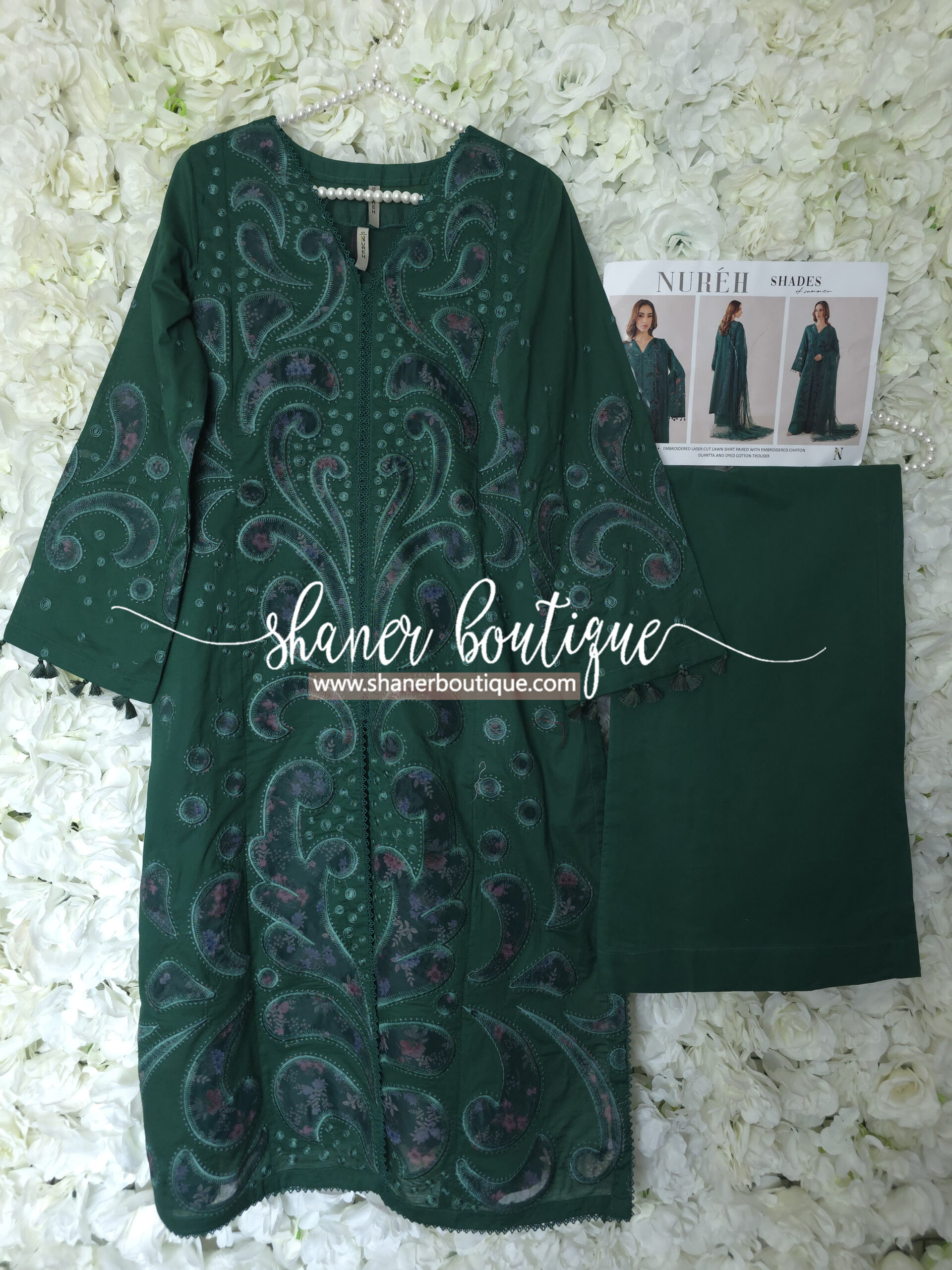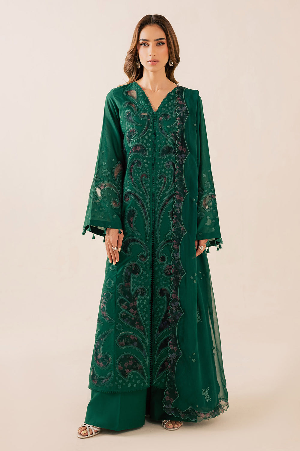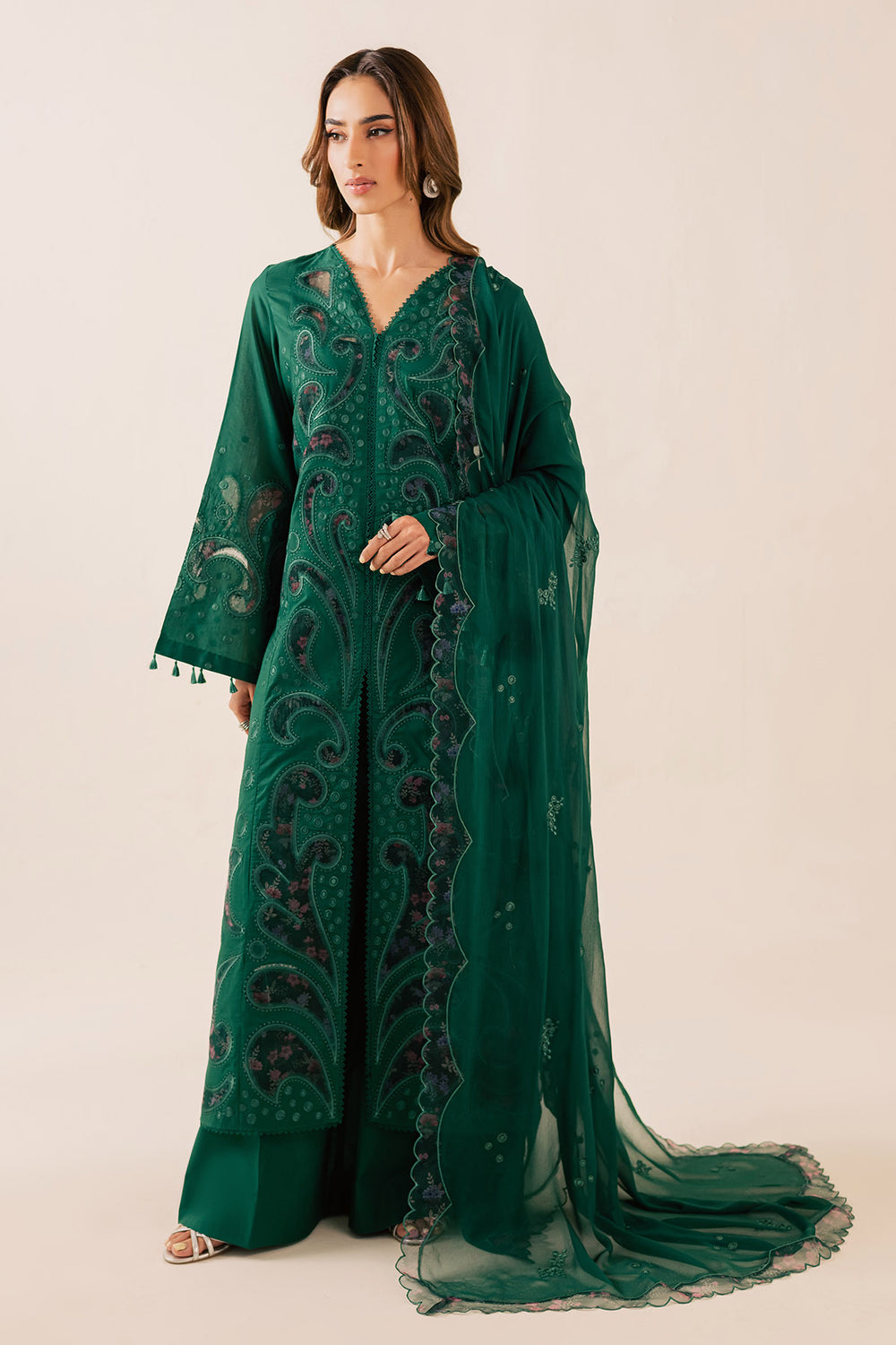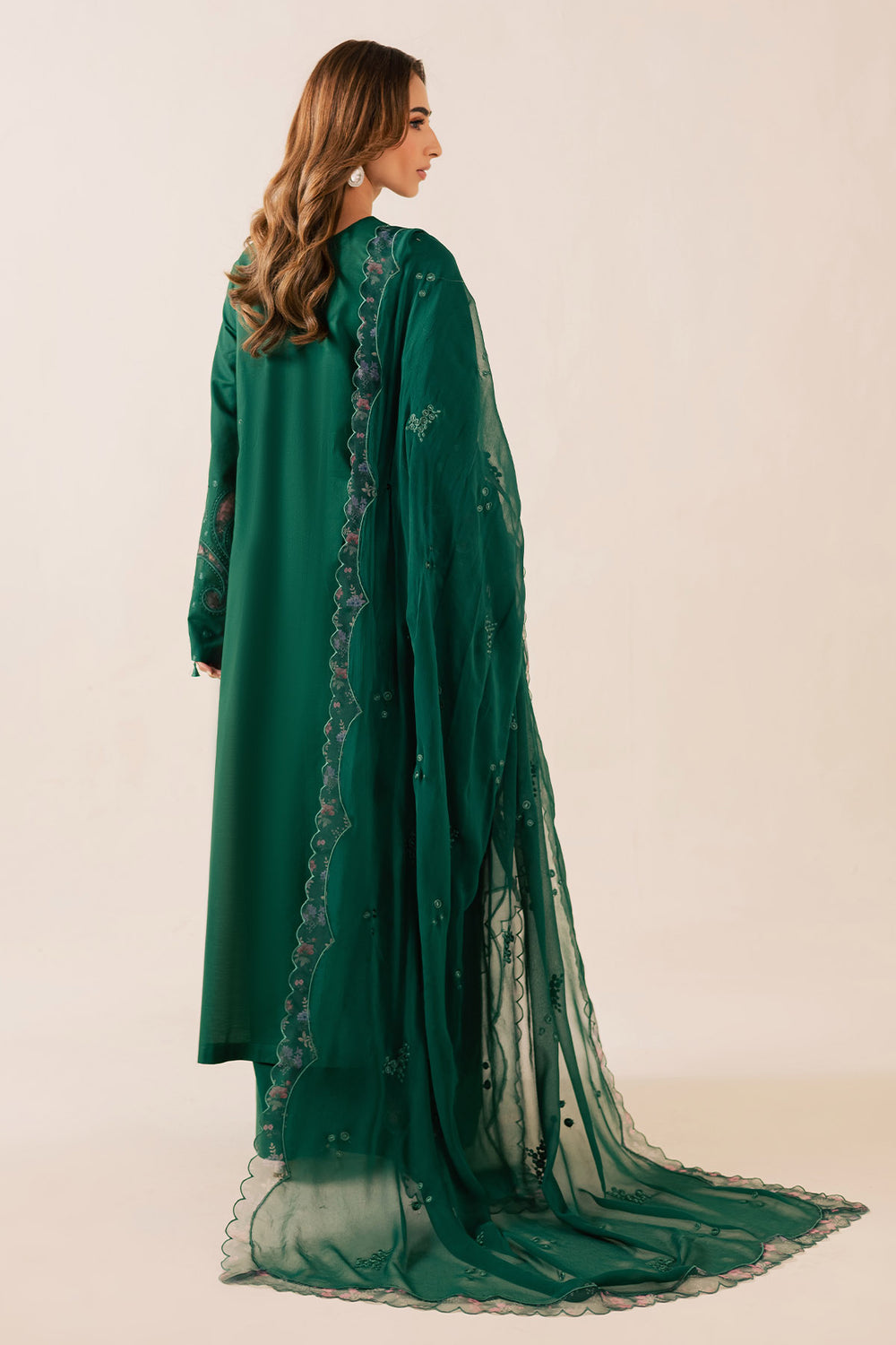 Color and Fabric: The outfit is a rich emerald green. The shirt fabric is described as lawn, the trousers are cotton, and the dupatta is chiffon.